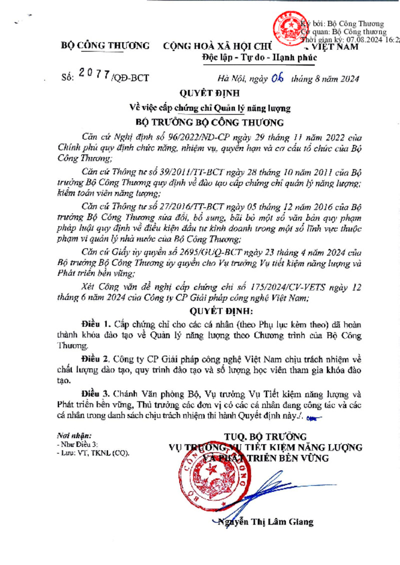 Loại tài liệu | Người ký | Vụ trưởng Vụ Tiết kiệm năng lượng và Phát triển bền vững Nguyễn Thị Lâm Giang | |