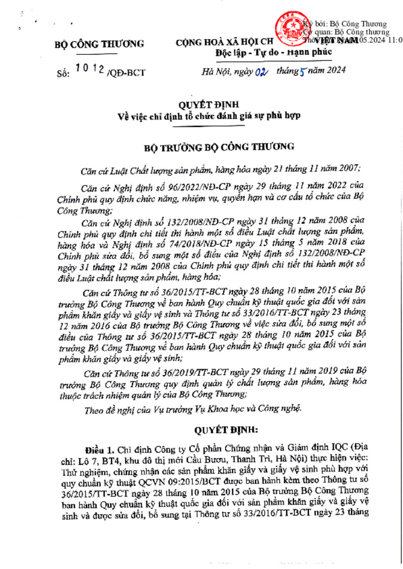 Số hiệu | 1012/QĐ-BCT | Cơ quan ban hành | |