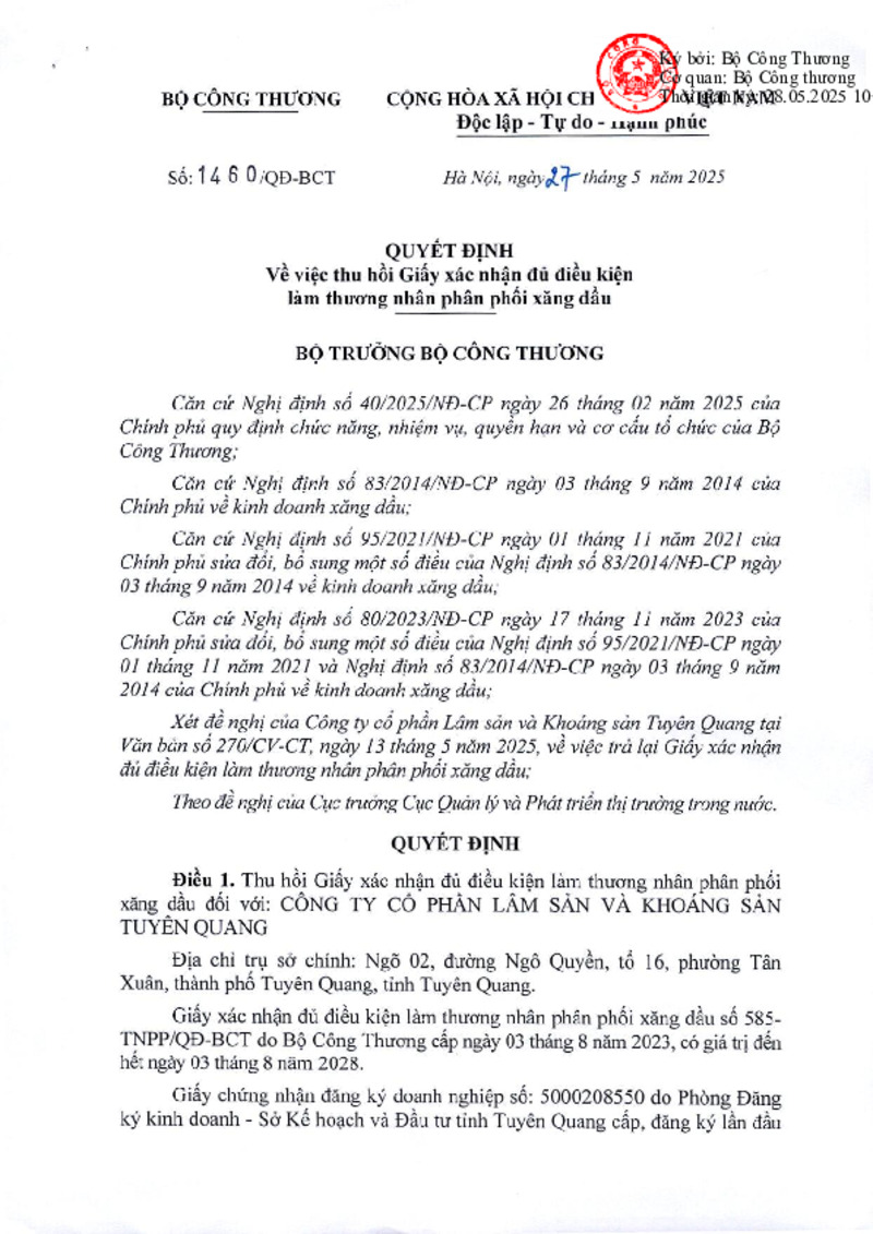 Số hiệu | 1460/QĐ-BCT | Cơ quan ban hành | Copyright © 33win.com Reserved |